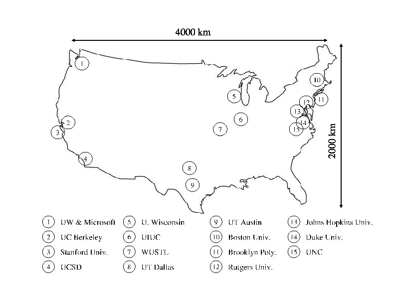 Locations of our traceroute sources in the U.S. Note that there were 17 hosts in 15 locations (two hosts each in Seattle and Berkeley).