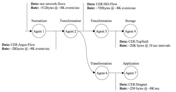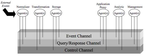 The general model engages a modified pipeline pattern where data sources are immediately normalized into a common event form. They may then be transported across a backplane of agents to optimize the flow of information to target analytics. Figure 3 shows a high-level view of the proposed architecture (as embodied in the reference implementation). The following is a short description of the core elements of the pipeline model.