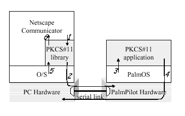 Figure 2 shows how our implementation works. The PC and the PalmPilot are connected through a serial link. We implemented the pieces shown in grey: a plug-in library for Netscape Communicator and an application for the PalmPilot. Communicator calls into our library when some cryptographic operation needs to be performed (1). If the request cannot be handled by the library itself, it forwards it to the PalmPilot (2). On the PalmPilot, the operating system notifies our PKCS#11 application when a request arrives (3). The application processes the request and returns the result to the PC (4), where it is received by the cryptoki library (5). The library will then return this result or a result based on what it received from the PalmPilot back to Communicator (6).