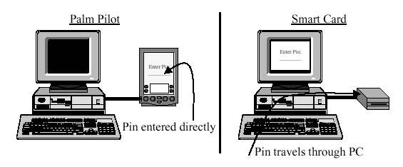 Figure 3: Information flow for PIN, contrasting traditional smart card and PalmPilot.