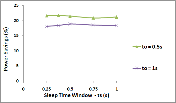 to ensure that the overhead of switching states is not higher than the power saving because of the sleep. TWP does not examine multiple observation time windows. The size of the sleep window, and hence ratio of the observation time window to the sleep window, is adaptively adjusted. This is equivalent to observing across multiple time windows.