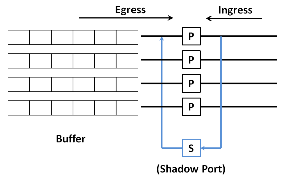 Buffering: Each port is bi-directional and has packets flowing into the switch (ingress) and away from the switch (egress). Egress packets are buffered automatically when the port is in low-power state. When a port transitions back to high-powered state, it processes the buffered packets. Ingress packets, on the other hand, have to be received by the port and forwarded to the buffers for further processing. Ingress packets are lost in current switches when they arrive at a port in its low-powered state. To address this, we propose the shadow port. A shadow port receives ingress packets if any of the conventional ports are in low-power state. A shadow port's hardware is similar to normal ports.