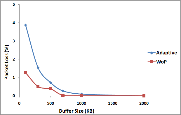 Packet Loss: Figures 3 plots the packet loss for varying buffer sizes, for the adaptive TWP scheme and how it decreases under Wake-on-Packet. Packet-losses decay exponentially as the buffer size increases. During prolonged idle periods, the adaptive scheme automatically increases its sleep window. This is likely to cause packet losses when packet flow resumes at higher rates because shrinking the time window takes time. But with WoP, the sleep window remains constant during the indefinite sleep. The curves show a packet-loss of under 1% for buffer sizes greater than 500 KB. Most modern switches support such buffer sizes (1) and thus the TWP scheme produces acceptable packet-losses.