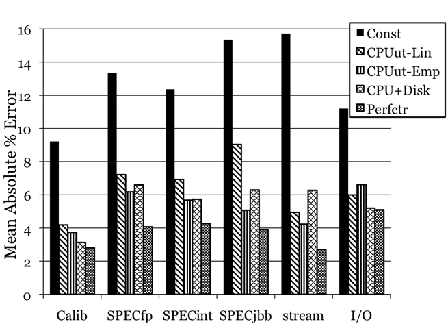 Figure 1 shows the mean absolute percentage error for each model across all of the machine configurations tested. The 90th percentile absolute error, which is omitted here for brevity, is not qualitatively different and is documented in [19]. The first cluster of columns shows the error for the calibration suite that was used to fit the models; the remaining clusters show the error for each of the benchmarks described in the previous section. Within each cluster, the leftmost bar denotes the error from the constant (utilization-independent) power model, followed by the linear and empirical CPU-utilization-based models, the linear CPU- and disk-utilization-based model, and finally the linear model using CPU performance counters in addition to the OS-reported metrics.