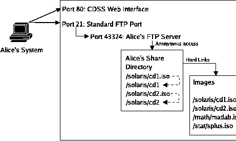 Image SelectionThe first step in any sharing session is for the user to make an image request. Each request needs to contain a set of images, any passwords required for those images and the IP addresses that will access the images. In order to simplify this process, CDSS contains a relatively simple web interface that allows the user to easily select the set of images they want to share and the protocols that they need access over. The web interface builds the list of available images at run-time, so there is no special configuration required to share a new image other than to place it into the image repository. The images can also be password protected on an individual or per-directory basis. It is also possible for the server administrator to share a set of images directly, without using the web interface. Figure 1 shows the client web interface on a small CDSS server. We can see that there are multiple directories that contain images. Each directory and file can have a password or set of passwords associated with it. If a user wants to access several files that require passwords, they can place the passwords in the input box for each directory, or they can place multiple passwords in a single input box. We also request a separate username and password from the user at request time. This username and password is used to identify the user's share and to prevent unauthorized removal of active shares. Along with images and passwords, users must select a set of protocols and specify any additional IP addresses that also need access to the images. Image PreparationOnce a user has successfully requested a set of images, they must be prepared for his use. Initially, all the images are stored together in a master directory tree. When a user makes a request, a new directory is created on the same partition as the master tree and the images requested are hard-linked into the newly-created directory. At this time, we also create individual subdirectories for each image and loop-back mount the images into these directories. This allows the requester to access the contents of each image directly, without having to download the image in its entirety. The loop-back mount can even be used for complete network-based installations directly, without the need to re-share the images. Because the images are loop- back mounted, any CD image that can be mounted by the system can have its contents shared by CDSS. Non-mountable images such as audio CDs can be shared, but only as raw images (the individual tracks or files can't be accessed). Server Configuration and ExecutionAfter the individual user directory has been created, the servers that provide the requested protocols need to be configured and started. It is important to note that multiple server instances are started for each user, one per protocol. Each server instance is configured to listen for in-bound connections on a non-standard port that is specific to that user. This port is chosen randomly and has no relation to the standard port that the protocol runs on. For each protocol we have a single standard configuration file, if one is required. Before the server instance is started, CDSS copies the standard configuration file into the user's image directory and makes any necessary changes to indicate the directory to be shared and the port to listen on. Then the server is started. Running a separate server instance for each user allows simple automated configuration and enhanced security. However, the redundancy in this system does place an increased load on the server due to the large number of active server instances. CDSS uses lightweight server programs when available and configures them with a minimum of options in order to reduce the CPU and memory usage of the system as a whole. Firewall ConfigurationOnce the system has prepared the images and started the necessary servers, the firewall must be configured to allow connections from the requesting user. Connections to the standard ports for each protocol must also be correctly redirected to the unique port allocated to the user for that protocol. Finally, the firewall rules must prevent non- authorized users from connecting directly to the server instances, bypassing the redirect in place on the standard port for each protocol. CDSS currently supports the Linux IPTables and IPChains firewalling systems, although it could be extended to support any firewalling system that can accept rule changes in real-time and transparently redirect connections to alternate ports on the same machine. SecurityAlthough the firewall configuration described above provides a large measure of security against the possibility of unauthorized access to files, it is also important to secure the web interface effectively. While the web interface is a very convenient way to provide access to large numbers of users without administrator intervention, it also creates the risk of exposing a setuid-root program to the entire allowed user base. CDSS uses extensive checking and verifying of user-provided input both in the web interface and in the master sharing script to prevent the compromise of the hosting server. The CGI web interface itself runs as an unprivileged user and executes the setuid-root script after the user has finalized the request in the web interface. Although it would be ideal to not have to run any part of the system as root at all, root-level permissions are required to maintain the loop-back mounts and adjust the firewall rules. The master sharing script is exceedingly cautious about verifying the data provided by the user and the programs that it executes as root. For most applications, the CDSS system will need to run on a server that has no unprivileged accounts on it as the media images are stored as world-readable files. It may be possible to use filesystem permissions on the master tree and the individual user directories. However, CDSS does not currently support this functionality. The substantial