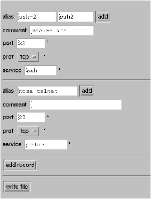The parser is configured to edit a particular kind of file by specifying the constraints upon the file in XML, using a syntax again similar to that of BABBLE [13] but more complex than that for the flat-file configurator above (FFC). For /etc/services, the constraint file is shown in Figure 6. The var fields describe variant text, while the repeat, optional, choice, and text elements have the obvious meanings. The comments in each kind of variable are a description provided to the user as help text. While this file may seem complex, it is nothing more than a detailed and highly documented regular expression! It says that a services file consists of services entries, one per line, where each line consists of a service name, a port, a forward slash, a protocol name, and optionally a list of aliases and/or a comment. Using this declaration, the parser converts the flat format of the source file to XML. The /etc/services source file: ssh 22/tcp ssh-2 ssh2 # secure shell telnet 23/tcp ncsa-telnetis translated into the XML in Figure 7. It is upon this intermediate form that editing takes place. There is presently one design flaw in the prototype: if no alias exists when the initial record is created, none can be added. The editing process is a web-based CGI script that presents editing options as pulldown menus and text fields (Figure 8). One can change or add fields by pressing the appropriate buttons or changing values and pressing "write." Prototype StatusCurrently, the only fully implemented part is the CGI-based editor for XML. The translators to and from XML are not yet implemented, though the translator into XML is almost identical with that for FFC above, and the XSLT for generating output is almost identical to that of Finke [23]. Thus we had high confidence in our future ability to implement these, and left them undone in this proof-of-concept prototype. ![]()