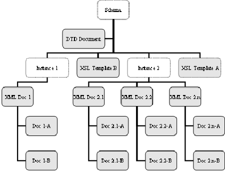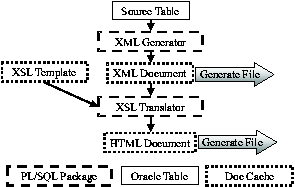 A second issue came up with the generation of web pages. As the visibility of web documents was growing, so was the interest by the "Marketing and Media Relations" folks in the actual appearance of the web pages, down to the use of graphics and buttons and the look and feel of the web pages. To make matters worse, this look and feel was constantly changing and evolving, and it was a chore to keep the generated web pages looking like the rest of the site's pages. Some of this could be handled via cascading style sheets, and some other tools to allow the graphics designers to specify sections of "boiler plate" within documents, but the basic structure and layout was still dictated by the PL/SQL code. Any change in what data elements were displayed, or even the order of columns in a table still required intervention by the programmers and that pleased neither the programmers nor the web folks. Clearly, we needed a way to separate the extraction of the data and it's reformatting. This would let the database programmers concentrate on extracting the data without getting bogged down with the final format issues. Folks who were concerned with format, such as web designers, marketing managers, etc., could concentrate on the formatting process. With the release of Oracle 8i, support was added for the processing and transformation of eXtensible Markup Language (XML) [2] documents. This provided a method of extracting the data from the database in a display neutral format, and then allowing the web designers to apply whatever transforms and formatting that was required. This meant that once the file extraction routine was written, the PL/SQL programmers were done and the web designers could take over and make formatting changes as their needs and schedules dictated. In addition, since the database could invoke the translations internally, we were able to keep all of the version control and process monitoring [8] features that we found useful in the first version, and use the same generic program to actually write the files. XML - A Brief PrimerThe "parent" of XML is Standard Generalized Markup Language (SGML). Another offspring of SGML is HTML, which many of us are already familiar with. One of the problems with HTML, is that it is not extensible, or perhaps worse, it does get extended by some browsers and servers and not by others. I am certain that many of us have visited web pages that don't work quite right on our browser of choice. XML was designed to be extensible, yet contained so that applications developed to process an XML document, can deal with any XML document. A good discussion of this is available in Chapter 6 of The LaTeX Web Companion [9], including why XML will not run into this problem, unlike HTML. But XML is not limited to document preparation. Another area where XML is used is in business to business applications to allow businesses to exchange information in a consistent manner. Inherent in an XML document, is the Document Type Definition (DTD). The DTD (or schema) provides a set of rules that not only defines the element names and types, but also the relationship between data elements in the XML document. This provides a way to validate an XML document to ensure that it is correct. This schema is in fact another XML document. By sharing these XML schemas, different parties can independently develop XML documents and interfaces that will inter- operate.