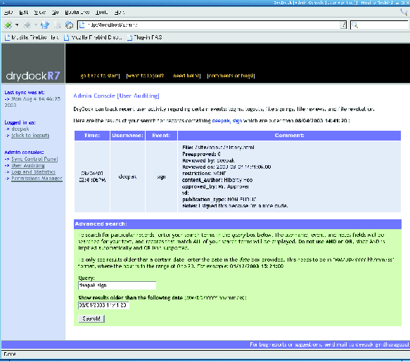 After looking over an unapproved file and finding it fit for public viewing, a content approver signs the file, instructing DryDock to mark the file as authorized for publication. For added security, DryDock can be configured to require additional information to complete the signing process, such as the name of the document author or a note explaining why the file is being signed. Once the file is signed, DryDock automatically copies it from the development tree to the export tree. Finally, DryDock synchronizes the staging server's export tree to the production server over SSH, replacing the external web site with an updated copy containing newly signed files. Since the staging server's export tree is separate from the development tree, deleting a file from one will not delete it from the other. To remove a file from the export tree, a content approver uses DryDock's web interface to mark that file as revoked. This removes the file from the set of files copied to the external web server during the next synchronization. While signing authority is given to a limited number of users, a larger number can be given review authority, or the ability to soft-sign files. Reviewing files follows the same process as signing files, save for two important differences: approval information is optional and can be incomplete, and reviewed files still require an authorized signature for publication. At ARL:UT, review is employed by users to partially fill in approval information for a file so that when a signer moves to authorize that file for publication, much of the data required is already present. Review provides much of the same functionality as signing a file, but without a signature's consequences. Though DryDock's approval process works well for most documents, rapidly changing documents must be continually re-signed by content approvers for each change to appear on the external web site. To ease dealing with these types of files, a user can sign them as pre- approved; files marked as such will be copied to the production server during synchronization even if their contents have changed since they were signed. Since file pre-approval circumvents DryDock's typical workflow process, we advise our users to apply the option sparingly; users must be vigilant about pre-approved files' content. Web Developer MigrationMigrating web developers to DryDock's web publishing process should be painless. Instead of placing content directly onto the production server, web developers now place documents onto the staging server. At ARL:UT, we configured our staging server to support the same access methods our web developers have always used: FTP, Samba, and NFS. Since nearly all off-the-shelf web development tools can use at least one these methods to edit pages, we simply instructed our web authors to re-configure their tools to point to the appropriate directory on the staging server. In most cases, web developers shouldn't have to change their pages for DryDock. In a proper DryDock setup, the staging server's web server environment mimics that of the production server, so properly functioning pages on the staging server will still work when exported to the production machine. The lone caveat is the avoidance of absolute links: since the production server (not the staging server) will be serving up content to the public, any links in a web page explicitly mentioning the staging server will not work. Relative links solve this problem by not mentioning the server name in the link address; the web server assumes the document is local. However, there is one situation in which use of a relative link is impossible. If page authors need to refer to a secure page from an insecure page, they need to refer to the host using https:// instead of https://. Since it isn't possible to specify a protocol in a relative link, an absolute link is required. The solution we employed at ARL:UT was to use a simple server-side-include variable that contains the host name of the machine from which the page is served. Page authors then construct an absolute link, using the variable in place of the host name, and the correct server name is inserted dynamically. Benefits to AdministratorsImproved Information SecurityDryDock safeguards against the dissemination of inappropriate web content by codifying a formal document approval process. It ensures that all updates to web content are inspected for propriety before they ever escape the shelter of the internal network. DryDock makes users accountable for the documents they approve; if content is found to be inappropriate, administrators can easily determine who let that content through. DryDock acts as a document firewall. Just as a traditional firewall regulates the flow of packets to a private network, DryDock regulates the flow of documents to the production web server; they are both access control mechanisms. Through signing, pre-approving, and revoking files, DryDock users create rule sets that manage the movement of documents into and out of its export tree. ![]() Content AuditingDryDock goes to great lengths to log all user and system activity and keep administrators abreast of all changes in web content. DryDock provides administrators with an auditing console that lets them browse DryDock's records. Administrators can inspect the most recent events, all events pertaining to a user, or any events within a specified date range, or they can perform a free-text search to tailor the results to their liking. For greater detail, administrators can peruse DryDock's extensive log files. To immediately notify administrators of changes in content, DryDock can be configured to send out email whenever activity occurs. With these tools, administrators can easily diagnose problems with content. If a document is approved that is later found to be unsuitable for the public, administrators can refer to the email DryDock sent when the file was signed; the email indicates the parties responsible for app