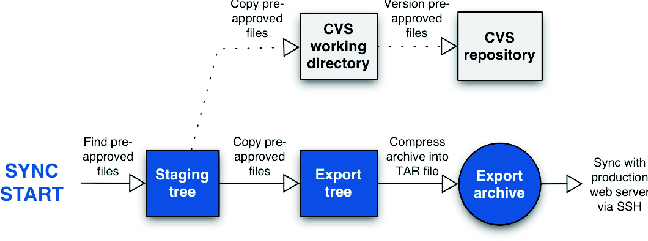 Though this worked correctly, synchronizations performed poorly. After investigation, we discovered that our use of CVS's export facility was a sizable performance bottleneck; the synchronization process spent over half its time waiting for the export to complete (Figure 6). Our answer was to continually maintain an image of the production web tree in a directory alongside the CVS repository; this is the export directory. Whenever a user signs a file DryDock copies it to the export directory, and whenever a file is revoked DryDock deletes it from the export directory. By continually maintaining this mirror of the production web site, we no longer need to perform a CVS export or normalize any directory names. Instead of creating this mirror at sync time, we can spread the work out over time, updating the mirror as changes occur. Table 6 shows that, by skipping these steps, we cut the sync time by 54.5% from 101 seconds to only 46 seconds. DryDock can use a variety of user-defined scripts to transmit the tar-archived export directory to the external web server. At ARL:UT, we use SSH. The production server is configured to automatically decompress the archive and replace its current web root with the new content. To make the process more secure, we use a pair of public and private cryptographic keys to establish the connection instead of a traditional user name and password combination, and the key is associated exclusively with the specific script that updates the machine's web root. EvaluationAll told, DryDock has moved us away from our largely unsecured and unrestricted web publishing process to one that affords us much better information security. It has made it possible for a large number of web authors to safely publish content to a web server that remains almost completely isolated from our internal network. By removing direct user interaction with the external web server, DryDock has allowed us to secure our web server to a degree not before possible [11]. And by enforcing a formal approval process, DryDock has given our management and administrators total publication oversight. DryDock has been governing our web presence for over one and a half years, and has proven itself to be stable and dependable. This notwithstanding, there are still several areas that could be improved. User Interface IssuesWhile DryDock scales well vis-a-vis directories containing thousands of files, its performance is overshadowed by slow web page rendering and the problems users have when operating on such large sets of data. DryDock uses HTML tables to display information about each file, and table rendering is notoriously taxing on web browsers. Consequently, as directories grow massive, a web browser cannot display much of DryDock's user interface quickly. Furthermore, DryDock's web interface isn't truly designed to operate on large amounts of data. Though users can simultaneously sign, review, or revoke multiple files in the same directory, the usability of a point-and-click, forms-based web interface doesn't scale well when dealing extremely large numbers of inputs. In spite of these structural issues, we've had few performance- related complaints. Most web developers simply don't work with thousands of files in a single directory - it's far too cumbersome. DryDock, optimized for interactive performance with modest data sets, suits the usage patterns and scale at ARL:UT. Moving Away From CVSWhile we were able to work around many of CVS's directory management problems through name mangling, overcoming its lack of a truly programmable interface is more problematic. To interact with CVS, DryDock is limited to invoking CVS's command-line tools and parsing their output. This output is designed to be easily readable by humans, not easily parsed by software [19]. This hinders DryDock's integration with CVS, and tight integration with a revisioning system is a prerequisite for DryDock to provide repository management and inspection features. CVS's directory management issues and its command-line interface are structural problems not likely to be remedied. We will migrate from CVS and towards a revisioning system that better meets our requirements. Ostensibly, the next-generation version control system that will best suit our needs is Subversion [4, 18]. Subversion tracks changes in directory structure, obviating our name mangling. More importantly, however, Subversion has a well-defined C programming interface and a nascent Python interface (DryDock's native tongue). Subversion is currently in development and we await its first stable release. File Pass-throughSince DryDock tracks changes in all approved documents, the size of DryDock's CVS repository increases as time goes on. Pre-approved files exacerbate the problem since their changes are committed to CVS at each sync; as syncs occur at least once per hour, pre-approved files are committed to CVS at least 24 times daily. One solution to this problem is to allow users to flag signed files as pass-through: files marked as such will not be added to DryDock's revisioning system. A signer marks a file as pass-through if tracking its changes over time isn't important. Marking pre- approved files as pass-through can slow the repository's growth, though at the expense of thoroughness. Incremental (.*?)sTo reduce sync time, DryDock could transmit updates to the production machine during each synchronization instead of transmitting the entire web tree. During a sync, DryDock could query the database to determine which files have been signed or revoked since the last sync. It could use this information to construct an archive containing any recently signed files, all pre-approved files, and a text file listing which files need to be deleted from the production server. This archive could then be transmitted to an update script on the external machine that will place the updated files in the correct locations and delete any files specified in the deletion list. For ad