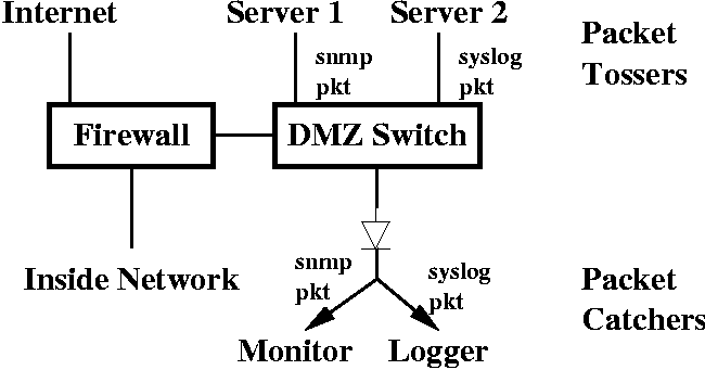 Tossing Packets Over the Wall Using Transmit-Only Ethernet CablesAbstractSolutions for transporting packets from an insecure DMZ into an organization's internal network are described. All of the solutions attempt to prevent the establishment of two-way traffic by physically cutting the transmit wires at the receiving device on the internal network. Because alternate paths to the packet sender could exist, a user-mode packet relay on the internal network is used to accept and re-transmit the packets to the appropriate destination. Applications discussed include relaying of syslog and SNMP trap packets from DMZ systems to receiving hosts on a secure network, and monitoring traffic for IDS and diagnostic purposes using a system conveniently located on the secure internal network. IntroductionAn Internet service connection point often consists of multiple security zones. At a minimum, most organizations will have a screening router and a firewall forming a DMZ between the devices. In addition, service zones for Web, mail, DNS, and other servers may be present [Zwi2000]. In order to manage systems in these zones, it is desirable, but potentially risky, to allow the systems to syslog, send SNMP traps, and perform other communication to the "Inside Network." It might also be useful to watch traffic in the DMZs for application diagnostics and intrusion detection. A common solution for the need to receive data for packet capture purposes, while blocking bi-directional IP communications, is to configure an Ethernet interface without an assigned IP address. While this may be effective, the risk that the interface might be accidentally reconfigured or be susceptible to a future exploit is too high when firewall bypass is the possible result. In order to receive IP traffic for other purposes, such as SNMP traps or syslog packets, the receiving interface needs to have an IP address assigned. We demonstrate several methods for allowing certain classes of packets, primarily UDP or packet capture traffic, to be passed unidirectionally from a lower security DMZ to a higher security zone, such as the corporate network. These methods involve the use of a uni- directional Ethernet link and, in most applications, a packet relay script running in user-mode. The major solution described has several pieces that are Cisco switch-specific, but enterprise switches from other vendors should have similar capabilities. The goal, illustrated schematically in Figure 1, is to provide a mechanism to receive syslog and SNMP trap packets, while not allowing any outgoing traffic associated with the incoming traffic. In other words, we want to break TCP and other bi-directional protocols. It is very important to realize, however, that simply snipping the transmit wires at the receiving system will usually not prevent the return traffic that we are trying to avoid because the system will always need another, fully capable, interface in order to be of any use on a network. If the regular interface can communicate with the source of the packets received on the "listen-only" interface, then the lack of transmit wires on that interface provides no protection. ![]() Previous Hardware MethodsA solution for safely accommodating UDP applications and traffic monitoring across security zones includes the use of "Transmit-Only Ethernet Cables." It would be nice if such a cable could be made by simply cutting the transmit pair at the receiving system. Standard 10/100 Mbps Ethernet hardware, however, requires link heartbeats that ensure devices are connected on each end of the cable. Cutting the transmit pair at a host causes the corresponding hub/switch receive pair to lose the link signal, causing the port to be shutdown. A search for such technology yields a number of possible solutions, most of which have significant problems. One solution places a capacitor across the transmit lines [Ng2001] which is supposed to mangle the data enough so that it is unintelligible on the other side, but not so much that the link integrity signal is lost. Other signal disruption techniques untwist the transmit pair or solder a paper clip antenna onto the transmit lines at the NIC card [Gra2000]. When security is the goal, this sort of solution is just not safe enough. We describe a number of techniques that physically break the transmit circuit on the monitoring system. These techniques include the use of UTP to AUI transceivers for 10BaseT [Gra2000], and for 100BaseT, specially constructed cables or junction boxes, and commercial Ethernet taps. Hardware ImplementationsTwo hardware implementations of the "packet over the wall" technique will be reviewed. It is important to analyze each technique in the context of the complete network to understand the possible impact on security. These techniques should significantly reduce risks, but are not a guarantee. AUI InterfaceThis solution is useful for packet capture from 10 Mbps Ethernet for diagnostic or intrusion detection purposes. It might also be useful for low-rate syslog or SNMP trap packet relay. The implementation, shown in Figure 2, requires parts that are not readily available as new products: an Ethernet card with an AUI connector (3COM 3C900-COMBO), an AUI cable, and a AUI/UTP 10BaseT transceiver. A 10 Mbps hub, a piece of equipment that might be getting more difficult to buy new, is also required. ![]() In this implementation, the AUI transmit wires (pins 3 and 10) are cut, or removed from the DB15 connector, at one end. There are no issues with the Ethernet link signal since it is supplied by the UTP transceiver. Fast Ethernet SwitchThis implementation, shown in Figure 3, will likely be the most widely used solution. The switch is located on the lower-security DMZ. The connection from the DMZ has a single pair, the transmit wires, running from the DMZ to the packet relay so that data can only be transmitted to the secure LAN. ![]() Our first technique for supplying the required link signal to t