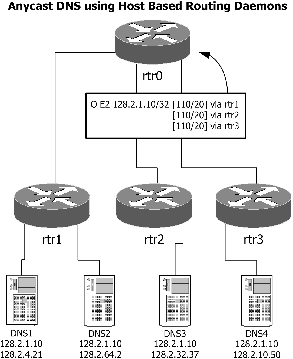 Server Address ChangesAn additional problem faced by DNS operators is the difficulty of moving DNS servers. Since, by definition, recursive DNS servers must be configured by IP address, when the DNS server IP address changes each client must update its server address list. The widespread use of DHCP helps minimize the difficulty of changing these addresses, but there are inevitably cases where DNS server information is statically configured. Before the use of anycast addresses at Carnegie Mellon, server transitions could take upwards of a year to complete as clients with old configurations were identified and contacted. The use of anycast DNS servers virtually eliminates the hassle of changing DNS server addresses. As new servers are added and old ones removed, traffic is automatically redirected by routers and clients are unaware of the particular server answering their DNS requests. Additionally, an enterprise with multiple locations could elect to use the same anycast addresses in all locations, further reducing the complexity of DNS server configuration. Anycast servers could be located in each location for low-latency resolution, backed up by central servers. In fact, proposals have been floated at the IETF to designate specific IPv4 addresses as well-known anycast recursive DNS addresses, to further reduce host configuration requirements. The SolutionIntroductionUsing anycast addressing techniques and host-based routing daemons, we dramatically increase the reliability of recursive DNS service. This reliability is achieved by eliminating the dependence upon a single machine to answer requests to a specific IP address. Specifically, multiple servers that provide identical DNS services are each configured with the anycast IP address on an interface. When using these techniques, a single unreachable host is of little consequence as routers redirect all requests to working servers. Designating AddressesThe first step in configuring this service is the designation of certain unicast IP addresses as anycast addresses. We recommend designating a small subnet for use as anycast addresses. While this subnet is not attached to any router interface, individual addresses within the subnet are used to provide a particular service. Specifically, it is undesirable for any client to believe the anycast address is on the same subnet as itself. This would lead to the client not forwarding requests to the first-hop router and defeat the principal strengths of the system. It is important the subnet is identified well, though, as one of the benefits of anycast DNS comes from the unchanging nature of the anycast service address. Once the subnet is identified, individual IP addresses within the subnet are allocated for use with a particular anycast service. Server ConfigurationEach server that participates as a member of the anycast service pool must have the designated anycast address configured on a local interface. Typically, a new virtual loopback interface is added and the anycast address is assigned to this interface. This provides the greatest flexibility to operators, especially if the host has multiple physical interfaces. If the anycast address is assigned as a secondary address of a physical interface, it would be unusable if the physical interface was inactive. The DNS server software must also recognize and listen to network requests on the anycast address. In most cases, this is as simple as starting the server software after the address has been configured. Depending upon the configuration, though, the address may need to be explicitly listed. In environments where anycast is the only valid method of querying the DNS servers, administrators may wish to specifically reject requests on the non-anycast addresses. This prevents any accidental reliance upon the unique unicast address of the server. Enabling RoutingOnce the servers are configured to service DNS requests using the anycast IP addresses, the routers must be setup to direct packets to one of the anycast servers. The simplest such configuration is to directly configure the anycast addresses as static routes on each server's first-hop router. Each static route must then be distributed through the intra-domain routing protocol. The static routes are added as /32 ("host") routes with the next-hop address being the unique address on the server's physical interface. While static routing does provide anycast service, further enhancements can be made. Specifically, by running a host-based routing daemon on each DNS server, the entire system is more robust and reliable. In this case, each server announces a route to its anycast address(es) using the intra-domain routing protocol. This route is then propagated through the routing domain, subject to the constraints of the IGP. Routers within the domain will select the best path to a server announcing the anycast address. The primary benefit of using a host-based router is the dramatically reduced response time from a server becoming unreachable. In the case of static routes, some DNS requests would continue to be forwarded to the unreachable server until the static route is manually removed. Using a host-based router, the first-hop router will identify (by the lack of protocol exchange) when the server is unreachable. At that time, routes originated by the host will be dropped from the routing table, causing routers to forward traffic to other working servers. Benefits and LimitationsWhile anycast is a good solution for providing recursive DNS service, it is not a panacea for reliability of all network services. Because routers may have multiple choices for the path of anycast- destined packets, sequential packets may follow different paths and arrive at different hosts. Therefore, anycast is best used only for stateless protocols, such as DNS, Kerberos, and syslog. If a protocol provides a mechanism for discovery of unique addresses within the first packet exchange, it may be suitable to use 