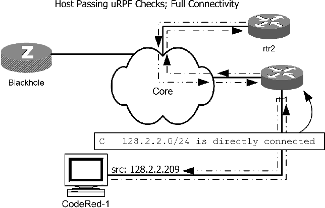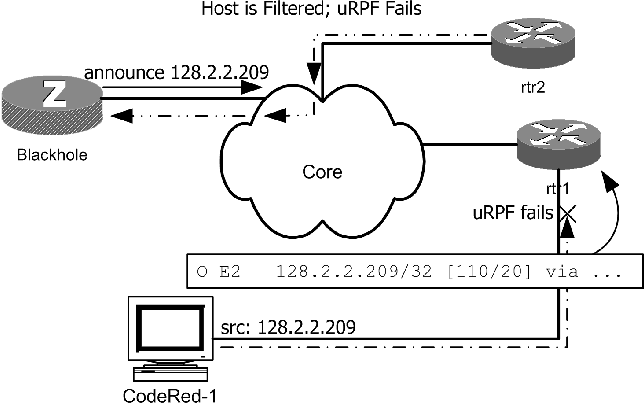 Using uRPF for Address FilteringAs network operators, we occasionally need to apply filters blocking certain source addresses from entering a router interface. In our network, there are two primary reasons for needing to do this. First, we sometimes want to block certain source addresses from entering at our border. This occurs when we are undergoing a network attack or otherwise have an administrative need to block packets from particular addresses. Additionally, we periodically need to prevent internal addresses from accessing the network. These blocks are typically applied to enforce administrative restrictions. For example, when a host is infected with a worm, we work quickly to filter the host, preventing further network abuse. While either source or destination-based address filters can be applied using access list style restrictions on interfaces, changing these filters is time consuming and error prone. In the midst of network abuse, such as a high-rate denial of service attack, changing filters can be especially troublesome. Administrators might have difficult connecting to the router and, once connected, might face difficulties with low resource availability. Even in otherwise stable conditions, changing access filters can be a complicated process. Destination Address FiltersAs we look beyond the use of access filters, we note that it's relatively easy to apply destination address filters; that is, block traffic bound for specific addresses or subnets. Null routes can be added to a sinkhole router in a network, and with proper redistribution any traffic destined for the address will be drawn to the sink hole. Using null routes is typically easier than filters for destination-based blocking, especially if a host-based routing daemon is the null route source. This does mean that traffic is not blocked at the edge; instead it is dropped at the originating router. Because routers are optimized to forward traffic, however, this is typically an acceptable tradeoff. Some interesting work has been done by operators seeking an efficient way to identify ingress access points of denial-of-service traffic. Working even in the face of spoofed source addresses, the Remote Triggered Blackhole Filtering [15] (RTBF) mechanism causes traffic destined for a specific address or subnet to be blocked at the network edge. Rather than adding a null route for the targeted address, instead an iBGP route to a specially-designated address is added. Each edge router is then configured with a null route to this special address. Packets to the blocked addresses are dropped at the network edge. By logging ICMP Unreachable message generation, operators can quickly locate the traffic ingress access point. Source Address Filtering with uRPFUnlike destination address filters, blocking packets from specific source addresses is harder to improve from traditional access lists. However, using uRPF-SM, we can enable faster filtering of specific source addresses. Using a host-based routing daemon, addresses or subnets to be blocked are configured as null routes and are redistributed through the routing domain. The strategies of RTBF to effectuate null routes at each router could also be used. Note that in most cases, we are talking about adding host routes to individual addresses to block. Adding these null routes serves two purposes: any traffic destined for the target IP will be redirected to the announcing router. Additionally, while ACL-filtered source addresses would ordinarily pass the uRPF check (and then be dropped due to the ACL), announcing a more specific route (in most cases, a host route) will cause routers within the domain to have a more specific forwarding table entry for the filtered IP range. This specific entry will be in the direction of the announcing router, not the normal ingress interface. Thus, using uRPF-SM the traffic will be dropped. Figure 7 and Figure 8 illustrate the network changes when an address is black-holed by the host-based router. This method is an improvement over the use of access lists, due to the relative ease with which source address filters can be effectuated. Host-based routing daemons provide the capability of easily scripting changes to the routing configuration. During network denial-of-service attacks, minimizing the time to apply filters translates into a faster recovery time. Additionally, this can relieve the burden on network operators to change router configurations, instead making the process of applying filters one that is more easily delegated. The procedures to enable the use of uRPF for source address filtering are:
