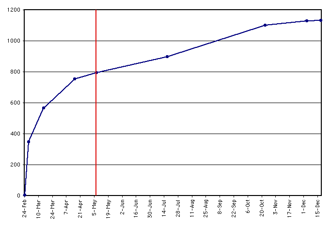 ![]() Number of documentsThe number of documents - or in reality, the number of unique document URLs - in the database grew over time. The initial bibliography collection phase, in fact, allowed us to begin production with nearly 800 documents. Table 3 and Figure 1 show the number of documents over time. The continued growth of documents in the Repository after going into production, not all of which were added by the librarians as an extension of the bibliography collection process, showed us that the Repository was indeed useful. This met our expectations.