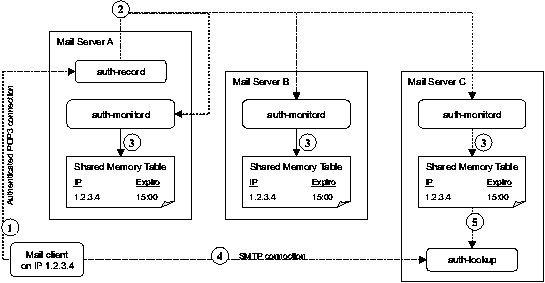 Figure 1 continues with our example data, and illustrates the flow of information between mail client and mail servers, and in between the mail servers themselves. In order to simplify the diagram, the only programs shown are auth-record, auth-monitord, and auth-lookup. The POP-before-SMTP process proceeds as follows:
