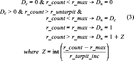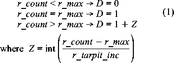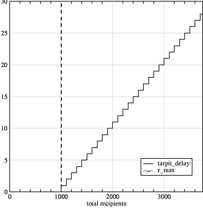 Tarpit ImplementationTheoryAn SMTP tarpit, as we have implemented it, starts off as a simple idea. If a particular remote system has sent us more than r_max mail messages, we insert a delay D between SMTP RCPT commands from the remote system and responses from our system. Then, as the number of messages continues above r_max, we increase delay D again once we have received r_max + r_tarpit_inc messages. We continue to increase D each time the total received messages[Note 5] has increased by r_tarpit_inc. If we call the received message count r_count, we get: ![]() 1 and x < 2)).