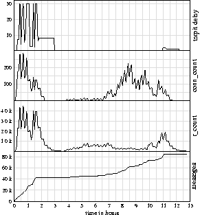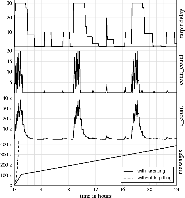 Having such a policy, agreed upon and signed off, is unlikely to protect you from the thorns - but it should provide something of a cushion. PerformanceThe tarpit software has been installed on our production systems since November of 2002. However, it was in measurement-only mode (notarpit=1) until mid-February of 2003. At that point the ability to delay mail was enabled, but the thresholds were still set quite high. A few weeks later, we were reasonably sure that the system was working as expected, without any side effects. At this point we lowered the thresholds to realistic values. Prior to this point we'd begun to see intense bursts of incoming mail on a regular basis. These incidents would drive our delivery attempts up to five or ten times the normal rate, resulting in some combination of: load spikes, mail delays, queues overflowing with undeliverable bounce messages, and/or bursts of mail from our systems to one or more external ISPs. The latter resulted from spam sent to invalid addresses bouncing to a fake return address at the ISP or ISPs in question. Since early March we have not been as drastically affected by spam. This does not mean that we have eliminated it entirely. We've even experienced a few more burst incidents, but tarpitting has kept the volume of the bursts down to only 2-3 times our normal traffic. Figure 6 shows data gathered from an actual spam sender. This set of data conveniently shows what works, and what doesn't work, about tarpitting. In the first two hours of the data set, recipient addresses are sent in at a fairly rapid pace, and tarpitting kicks in after 15 minutes - on average the rate is 7 messages/sec, and more than 40,000 messages are sent in total. The fluctuations in tarpit_delay are directly related to the reduction operations on r_count. The sender appears to have noticed that tarpitting is taking place, and then tries to work his way around it. Over three hours, 3000 messages are sent at a rate of about 20/min. Entirely reasonable. Finally, at 6.5 hours, things start to pick up again. Over the next 4.5 hours, mail is sent at a more rapid pace, but tarpitting isn't triggered. The sender doesn't come to our attention except during the last burst at the end. Still, in order to stay under our radar they had to keep their send rate at two messages/sec. ![]() Overall, the tarpit software is doing a good job of preventing denial-of-service levels of spam. Yet we'd prefer that anybody sending 40,000 messages in a four or five hour period was brought to our attention, and either whitelisted or blacklisted. Future WorkThe first focus area for improvement is the `grace period' - this is the time period where a spammer opening multiple connections can get a large number of messages in before tarpitting starts. Multiple connections opened at the same time, when the shared tarpit_delay is zero, result in (r_max times connections) messages getting in without being delayed. This also accounts for the initial steep slope in the Figure 4 messages graph, which we have seen in practice. So our first idea for improvement was to ask qmail-smtpd to send incremental updates - instead of updating the shared memory table at the end of a session, update it every time 100 RCPT commands have been issued. In an "ideal world" situation with lots of connections opening in a short period of time, and messages being sent as quickly as possible for as long as possible, this doesn't make a lot of difference. Under these conditions, data in the shared memory table only benefits new connections - and the bulk of the new connections happen all at the same time as seen in Figure 4. However, if new connections are established in a more random fashion, incremental updates would help ensure that more accurate estimates are available to the connections. In either the ideal or real world cases, incremental updates also give an administrator a more accurate view of the state of the tarpit system. Another accuracy issue is shared table synchronization across systems - as is, tables are never going to be entirely in sync: each system does its own reduction operations, which won't happen at the same time, and multicast is not a reliable protocol, so there is the potential for lost updates. We've discussed a few ideas for improvement, but generally we've tried to avoid depending too much on strict synchronization - distributed systems are an entire field of study in themselves, and not what we want to concentrate on. As an alternative solution, we could limit the number of