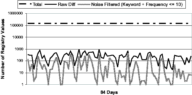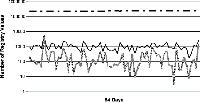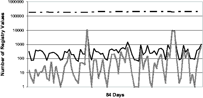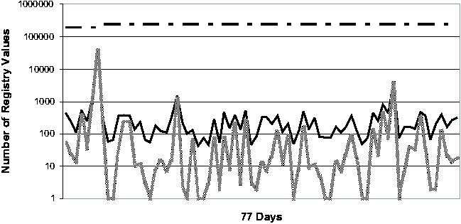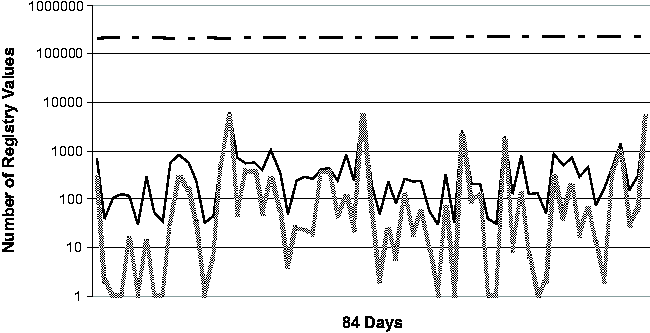Registry Change BehaviorThe common perception of the Windows Registry is that it contains an enormous amount of undocumented configuration information that is accessed frequently by various applications and OS components. To our knowledge, the study that we present in this section is the first quantitative study of Registry change behavior. In addition to providing insights for the troubleshooting problem, the study should serve as a useful guide for the general CCM community as well. We studied the Registry from two perspectives. First, we looked at the aggregate change behavior of the Registry over a long period of time, ranging from 77 to 84 days. (These numbers are roughly determined by the number of available System Restore checkpoints per machine.) Next, we looked at the daily behavior of the Registry over the same observational period. We expect that Strider troubleshooting will most frequently be applied to a good checkpoint and a bad checkpoint that are close together in time, and therefore we expect the daily behavior of the Registry to be a good guide to the performance of the state diffing part of the Strider toolkit. The machines in our study consisted of four developer workstations