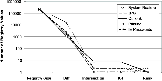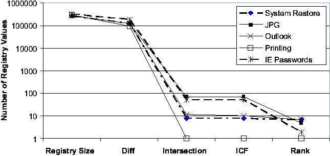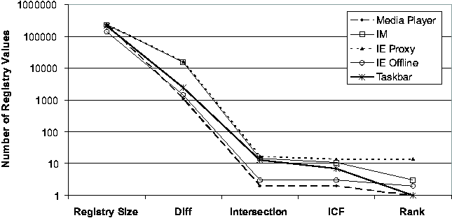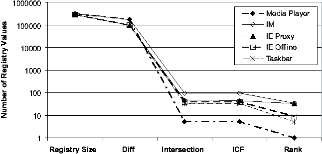 "Registry Size" is the average number of Registry values of the two checkpoints; "Diff" is the number of Registry values in the state diffing result; "Intersection" is the total number of Registry values appearing in the report, which consist of all the entries in the intersection of keyword-filtered diff and trace; "ICF" excludes those entries in the report whose ICF scores are below the default threshold; "Rank" is the order ranking of the root cause in the ICF- filtered list. The effect of each step in the Strider troubleshooting process is evident from the Figures. Typically, state diffing reduces the dimensionality by two orders of magnitude (from 200,000 to roughly around 2,000) and diff-trace intersection reduces it by another two orders of magnitude (from 2,000 to below 20). Even in the three cases where state diffing could provide only one-order-of-magnitude reduction because the 7-day period covered some significant installation events, the intersection still effectively brought down the number of candidates to below 20. The ICF threshold-based noise filtering provided additional help for the three cases with more than 10 entries in the intersection (in Figure 4 (b)): it reduced the numbers from 17, 15, and 13 to 14, 11, and 7, respectively. The final ranking summarizes the overall effectiveness of Strider troubleshooting: the actual root cause was identified as the number 1 candidate in 6 of the 10 cases, as number 2 in two cases, and as number 3 in one case. The root-cause rank for the IE Proxy case was 14, which would require more manual analysis effort to filter out the false positives. We are currently investigating ways to group together relevant final entries to aid manual analysis. Sensitivity AnalysisWe performed additional experiments to study the sensitivity of the troubleshooting results to variation in the machine being examined and the time interval of the diff. We let the time between the good checkpoint and the bad checkpoint vary between 3, 7, or 14 days. We varied the machine under consideration across all five machines in our study, and we examined four cases: System Restore (case 1), JPG (case 2), Media Player (case 6), and IM (case 7). The final ranking results are presented in Figure 5. We found the Strider troubleshooter to be robust to both factors being studied, although varying the factors did have some impact. In three of the four cases, the choice of machine affected the root-cause ranking, although the final rank remains number 3 or better in every case. In the case of machine #5 with case 6, we found that varying the offset in time from 7 to 14 days caused the root-cause rank to drop from 1 to 2. ![]() ![]() Cross-machine TroubleshootingAlthough the current version of the Strider toolkit is primarily targeted at same-machine, cross-time troubleshooting, we have conducted some preliminary experiments and found that it can be useful for cross-machine troubleshooting as well. We used the same 10 cases, but with checkpoints from two different machines: the configuration failure was introduced into one machine to make the target program action fail, while the same action succeeded on the other one. Figure 6 shows the results. First, we observe that the current state diffing tool is less effective in the cross-machine scenario; it reduced the number of entries by about two thirds, in contract with the two orders of magnitude in the same-machine case. There are at least two factors that contributed to this: (1) different machines can simply have very different sets of installed programs; (2) the "same" Registry entries can appear to be different on different machines because their names contain machine-specific information. We are currently investigating a set of mapping rules to eliminate the latter. Fortunately, the intersection operation remained effective and reduced the number to below 100 in all cases. The ICF noise filtering is only slightly useful for half of the cases because the static dictionary built from cross-time diffing analysis may not be suitable for the cross-machine scenario. We expect that a separate dictionary based on cross-machine diffing analysis of each Registry entry among a large number of checkpoints would improve the filtering. The final step of applying the order-ranking heuristics was still mostly effective: in eight of the 10 cases, the root cause ranked number 10 or better. But for the IM case and the IE Proxy case, the root cause ranked 36 and 33, respectively. Discussions and Future WorkIn this section, we discuss additional issues and factors that can potentially impact the effectiveness of Strider troubleshooting and were not covered by our performance evaluations presented in the previous section. We also discuss several types of problems for which the current version of Strider cannot successfully provide diagnosis, and we outline our future work directed at addressing these problems. In general, the challenge is to ensure that the mechanical operations capture the root cause, to understand the limitations of our current noise filtering techniques, and then to further exploit the mass to facilitate the final step of root cause analysis. Capturing The Root CauseIn most cases, it is fairly clear which application's execution should be traced. For example, in the Media Player case, we traced wmplayer.exe; in the IM case, we traced msmsgs.exe. Per-process traces were used for all the cases except for the "Taskbar" case, in which traces for both iexplore.exe (IE) and explorer.exe (Windows Explorer) were included because it was difficult to determine from the symptom which one was the offending application. Although they usually achieve good root-cause ranking, per-process traces capture only "direct dependencies" (i.e., Registry accesses made by the target process) and may miss the root cause contained in "indirect dependencies." For example, in a case where a pop-up stopper designed to stop pop-up ads interfered with th