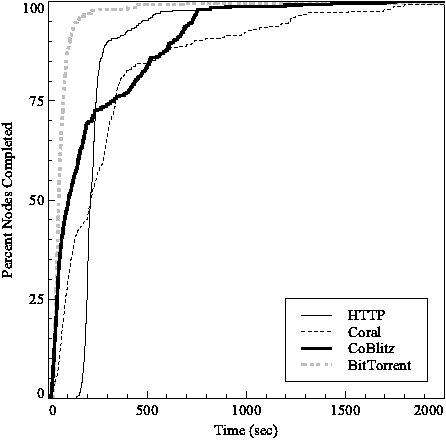 Figure 8 shows the cumulative distribution of client completion times. More than 78% of the nodes completed the transfer within 90 seconds using BitTorrent, compared to only 40% of the CoBlitz and 23% of the Coral nodes. None of the HTTP nodes finished within 90 seconds.