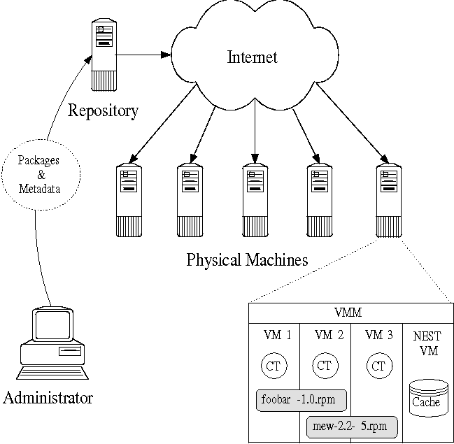 The growing popularity of virtual machine (VM) environments such as Xen [3], VMWare [31], and Vservers [17, 18], has placed new demands on package management systems (e.g., apt [2], yum [36], RPM [27]). Traditionally, package management systems deal with installing and maintaining software on a single machine whether virtual or physical. There are no provisions for inter-VM sharing, so that multiple VMs on the same physical machine individually download and maintain separate copies of the same package. There are also no provisions for inter- machine package management, centralized administration of which packages should be installed on which machines, or allowing multiple machines to download the same package efficiently. Finally, current package management systems have relatively inflexible security mechanisms that are either based on implicit trust of the repository, or public/private key signatures on individual packages.