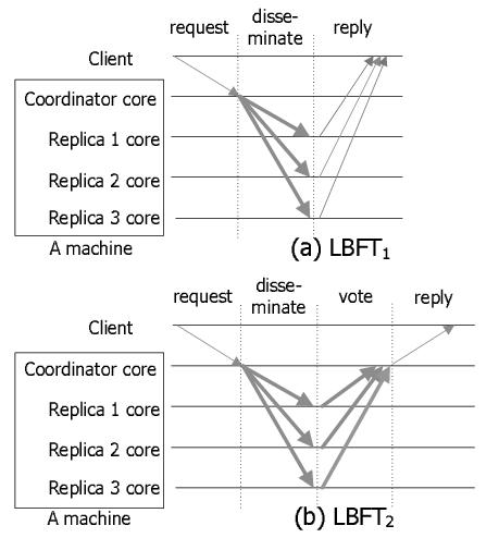 LBFT1: In LBFT1, we assume a trusted coordinator, asynchrony, and non-transparent replication. We run one coordinator and a set R of 2f + 1 execution replicas to provide both safety and liveness with up to f Byzantine faults. Figure 2(a) shows LBFT1, our simple protocol that uses the trusted coordinator. When p, the coordinator, receives req = ⟨ Request, o, t, c⟩{c},R,1 from client c where o is the operation requested and t is the timestamp, it multicasts to R a ⟨ Dist, n, req ⟩ message where n is the assigned sequence number. Note that there is no authenticator in this message. Each replica executes the request, and sends a reply message to the client. When the client receives f+1 valid matching reply messages forming the reply certificate ⟨ Reply, n, t, c, r ⟩R,{c},f+1, it accepts the result r.