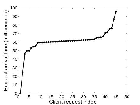 Synchronization: We logged the arrival times of each incoming HTTP request at the target server. Figure 3 shows the arrival time of each request with a crowd size of 45 clients. In these experiments, the coordinator commands the clients to make a HTTP request 15s after taking the latency measurements. About 70% of the requests arrive within 5ms of each other (clients 7 through 40), and 90% of the requests arrive within 30ms of each other (clients 3 through 43), indicating that our synchronization algorithm works quite well.