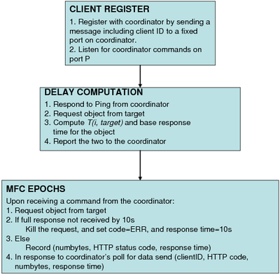 We have implemented the MFC approach as described above. We use hosts from PlanetLab as the MFC clients. Our coordinator runs on an off-the-shelf Linux host located at UW-Madison. Figures 2(a) and (b) provide additional details of the functioning of clients and the coordinator. While these largely reflect the discussion in Section 2.2, a few points are worth noting.
