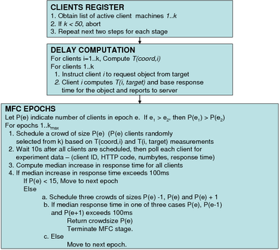 The MFC technique is based on a phased set of simple, controlled probes in which an increasing number of clients distributed across the wide-area Internet make synchronized requests to a remote application server. These requests attempt to exercise a particular part of the infrastructure such as network access sub-system, storage sub-system, or back-end data processing subsystem. As the number of synchronized clients increases, one or more of these resources may become stressed, leading to a small, but discernible and persistent, rise in the response time. Inferences can now be made about the relative provisioning of the resources. The number of clients making simultaneous requests is increased only up to a set maximum – if no change in the response time is observed, we label the application infrastructure as unconstrained. Such a conservative approach allows MFC to reveal resource constraints while limiting its intrusiveness on the tested sites.