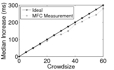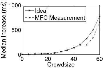 Role of “Measurers”: We can augment MFC with a set of “measurers” that independently measure the response time at the target and report these to the coordinator. The measurers can either make concurrent requests for the same object requested by the crowd or have the flexibility to request other objects. The latter approach can help quantify correlations among resources on the target server (e.g., how does a disk-intensive workload impact the response time of a database-intensive request?).