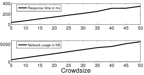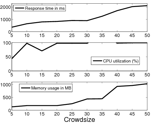 We experimented with two server-side software interfaces for the DB back-end: the FastCGI [8] module and Mongrel [12], a lightweight module explicitly designed for handling dynamic objects. When using Mongrel, we noticed that the response time stays within 10ms for crowd sizes up to 50 (not shown); the CPU utilization and memory usage stayed constant and low. However, an inefficiency in the FastCGI implementationFastCGI forks a new process for each request. As the number of requests increases, each of the forked process independently inherits the memory image of the parent process leading to very high memory usage during the experiment. caused memory usage on the server to increase dramatically with the crowd size (Figure 6). Consequently, client response time also increased significantly.