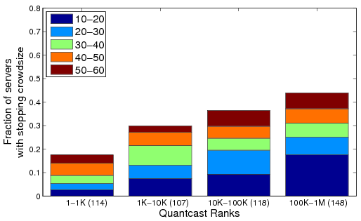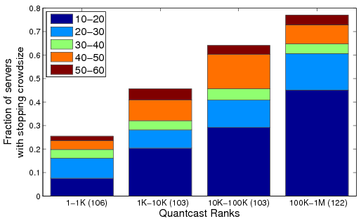 Figure 8: Breakdown of stopping crowd sizes for the Small Query stage for various Quantcast rank ranges.