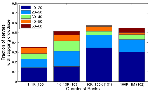 Figure 7: Breakdown of stopping crowd sizes for the Base stage for various Quantcast rank ranges.