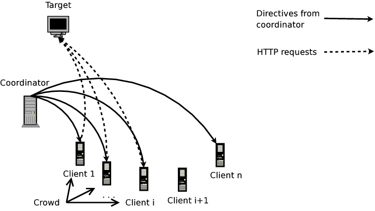 2. Progress: If there is no perceptible increase in the target's response time, or the check phase fails, the coordinator progresses to the next epoch where a larger number of clients participate. To ensure that the target does not face sudden load surges, the coordinator increases the size of the crowd by a small value (we choose this to be 5 or 10 in our experiments).