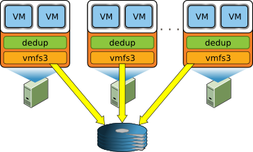 Figure 1: Cluster configuration in which multiple hosts concurrently access the same storage volume. Each host runs the VMFS file system driver (vmfs3), the deduplication driver (dedup), and other processes such as VMs.