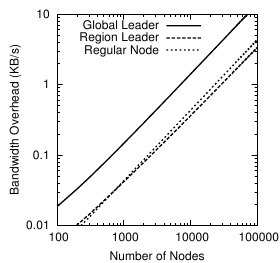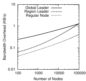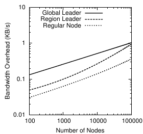 Even with the multi-region structure, scalability is ultimately limited by the need for every membership event in an epoch to be broadcast in the next item. The bandwidth costs of doing so are proportional to the number of nodes and the churn rate. For most systems, this cost is reasonable; our analysis in Section 6.1 shows, for example, that for systems with 100,000 nodes, even with a very short average node lifetime (30 minutes), average bandwidth overhead remains under 5 KB/s. However, for extremely large, dynamic, and/or bandwidth-constrained environments, the updates may grow too large.