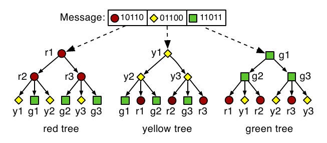 Our overlay consists of a set of trees, typically between 4 and 16. The trees are interior-node-disjoint: each node is an interior node in at most one tree. We refer to each tree by a color, with each node in the system also assigned a color. The interior of the red tree is composed completely of red nodes, ensuring our disjointness constraint. The nodes of other colors form the leaves of the red tree, and the red nodes are leaf nodes in all other trees. Using an even distribution of node colors and a fan-out equal to the number of trees provides load-balancing: each node forwards only as many messages as it receives. Figure 1 illustrates the distribution trees in a 3-color system.