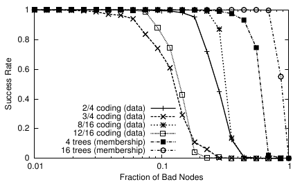 The membership update in each item must be sent in full along each tree, since it is used to construct the trees. The application data in an item, however, is split into a number of erasure-coded fragments, each of which is forwarded across a different tree. This provides redundancy while imposing minimal bandwidth overhead on the system. With n trees, we use m of n erasure coding, so that all nodes are able to reconstruct the original data even with failures in nm of the trees. This leads to a bandwidth overhead for application data of close to n/m, with overhead of n for the replicated membership update. However, as Section 4.4 describes, we are able to eliminate nearly all of this overhead under normal circumstances by suppressing redundant information.