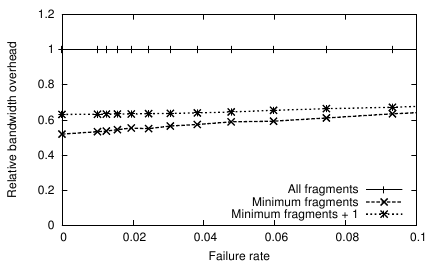 Using erasure coded fragments allows Census to provide high reliability with reasonably low overhead, but is not without bandwidth overhead altogether. In a configuration where 8 out of 16 fragments are required to reconstruct multicast data, each node sends twice as many fragments as strictly required in the non-failure case. Furthermore, membership updates are transmitted in full on every tree, giving even greater overhead.