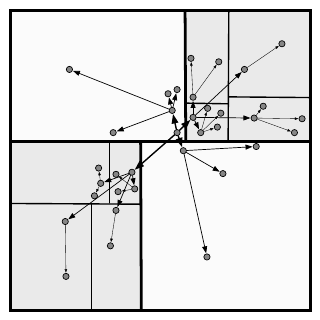 Figure 2: Hierarchical subdivision used to build interior tree with fan-out 4. Each region with more than 4 members is recursively split into smaller sub-regions.
