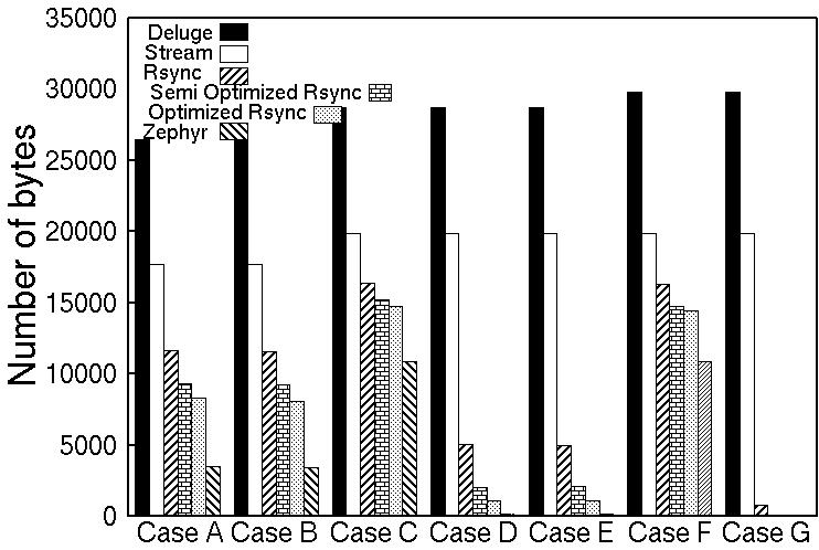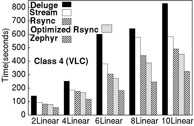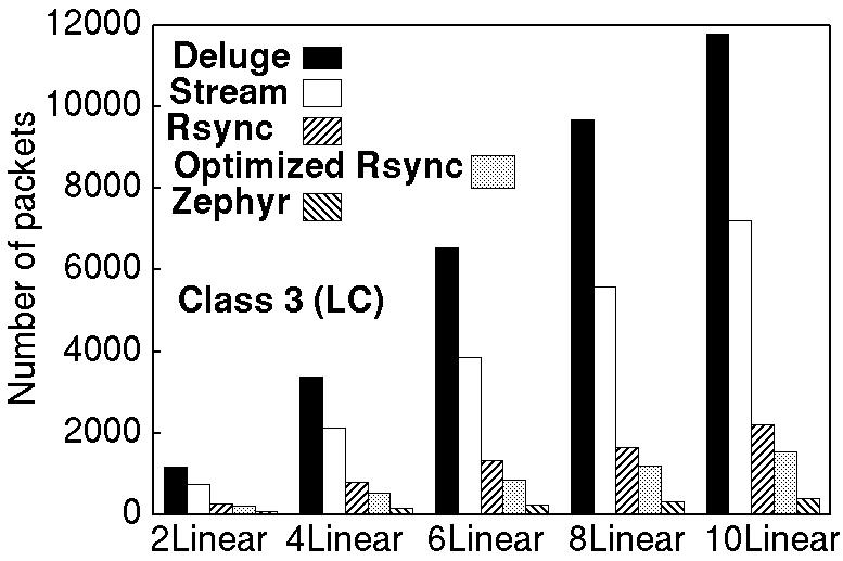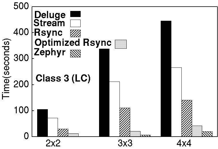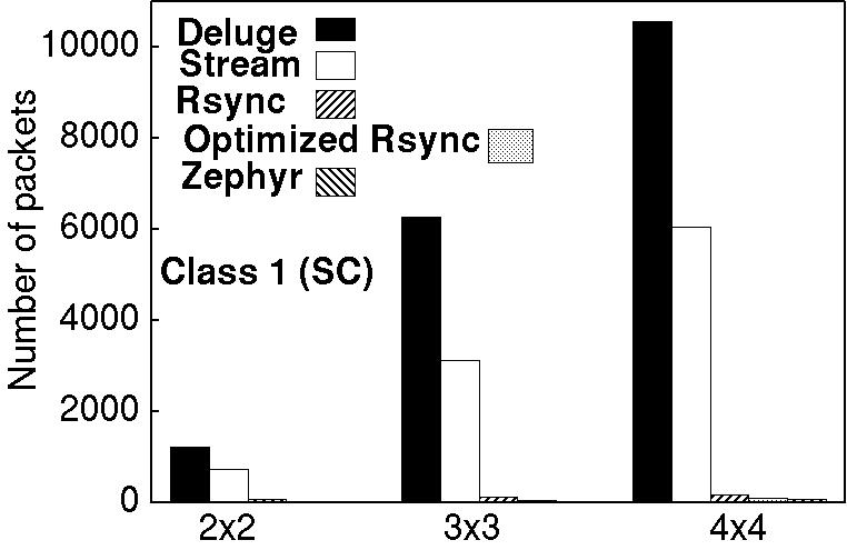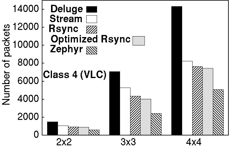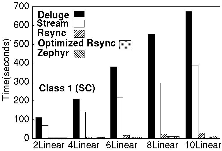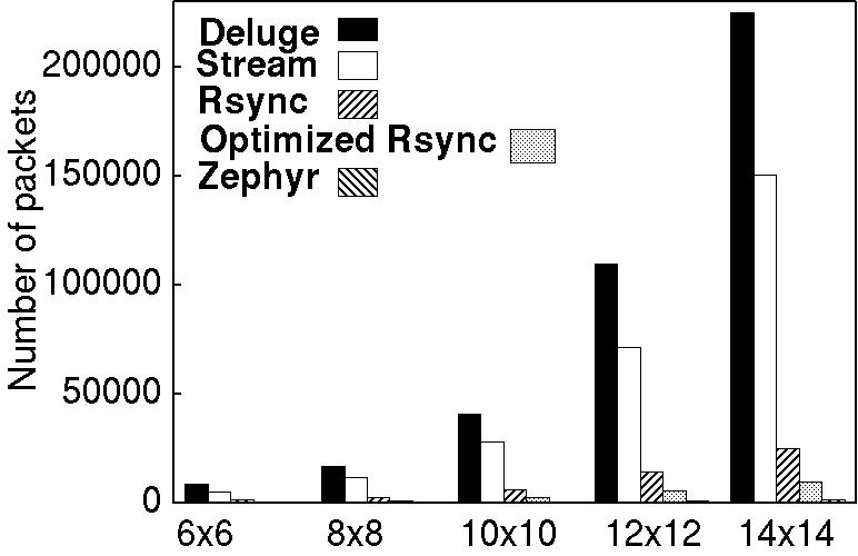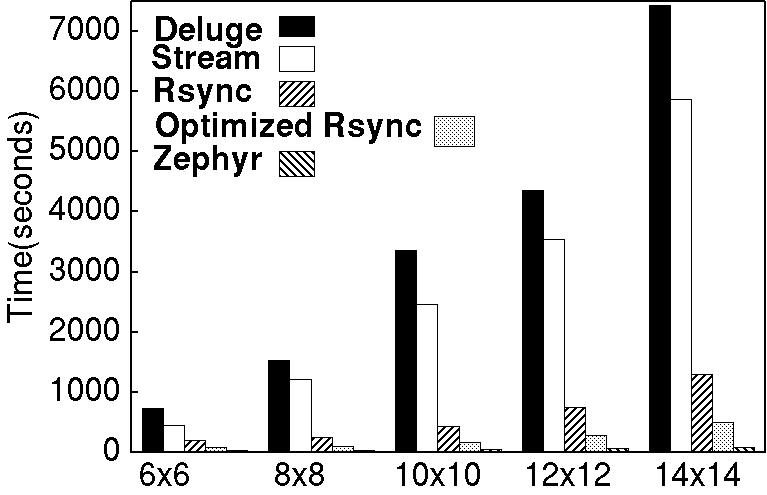 networks. As expected, Zephyr outperforms non-incremental reprogramming protocols like Deluge and Stream significantly for all the cases. Zephyr is also up to 12.78 times faster than Rsync, the approach by Jeong and Culler [8]. This illustrates that the Rsync optimization and the application-level modifications of Zephyr are important in reducing the time to reprogram the network. Zephyr is also significantly