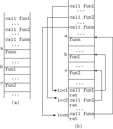 The approach we take to mitigate the effects of function shifts is as follows: Let the application be as shown in Figure 4-a. We modify the linking stage of the executable generation process to produce the code as shown in Figure 4-b. Here calls to functions fun1, fun2,..., funn are replaced by jumps to fixed locations loc1, loc2,..., locn respectively. In common embedded platforms, the call can be to an arbitrarily far off location. The segment of the program memory starting at the fixed location loc1 acts like an indirection table. In this table, the actual calls to the functions are made. When the call to the actual function returns, the indirection table directs the flow of the control back to the line following the call to loc-x (x=1,..., n). The location of the indirection table is kept fixed in the old and the new versions to reduce the size of the delta.