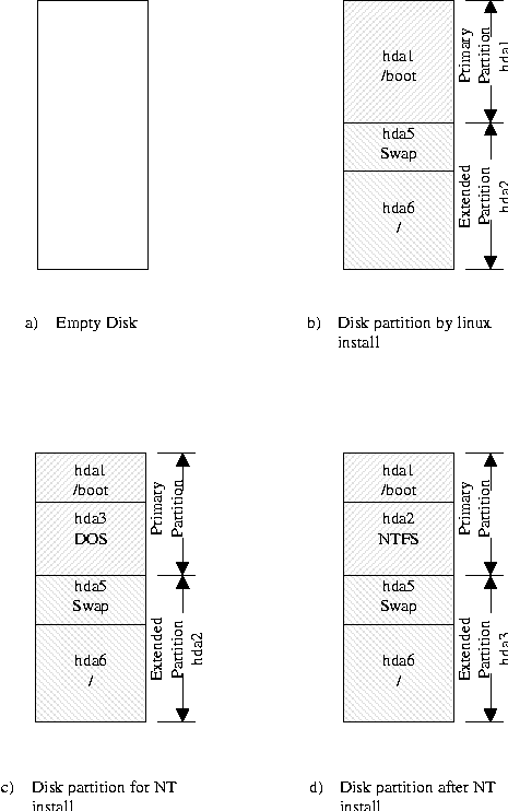 During the installation, NT makes its own partition active. Therefore when the NT installation finishes, the system immediately boots NT, without going through LILO. We run a script as the last part of the NT installation to mark partition 1 active again. This makes the boot process go through LILO, giving the choice of booting into either NT or Linux, with NT being default.