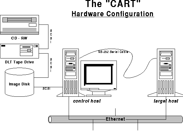 To make use of the existent JumpStart technology as implemented on the Solaris Install CD, the CART performs the following steps: (1) partitions a hard disk drive (which will be referred to as the ``image disk'') to have slices that mimic (size and location) the Solaris Install CD; (2) creates filesystems on the slices; (3) copies select contents of the Solaris Install CD to the corresponding slices on the ``image disk''; (4) opens up the permissions on the directory and files where the JumpStart mechanism resides; (5) replaces the standard issue JumpStart BEGIN script, PROFILE, FINISH script, and RULES.OK file with its own highly customized versions; and, (6) installs the appropriate platform-specific bootblock that corresponds to the platform of the ``target host.'' See Figure 1 for a quick overview of CART's hardware configuration.