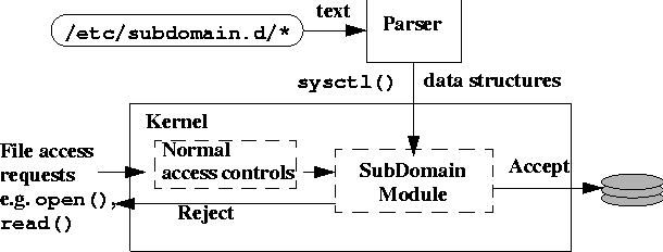 SubDomain is a kernel extension designed specifically to provide least privilege confinement to suspect programs. SubDomain allows the administrator to specify the domain of activities the program can perform by listing the files the program may access, and the operations the program may perform. SubDomain restrictions complement the native access controls, in that SubDomain never expands the set of files a program may access, i.e., any file access must pass the native access controls and the SubDomain restrictions before access is granted. Thus SubDomain confinement makes a program monotonically safer to run.
