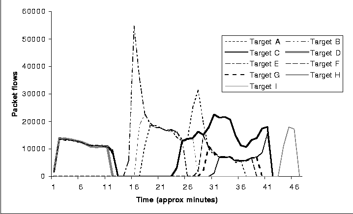 For example, the typical argus data file at that time of day (night) would be 4Mbytes but these grew to between 40 and 100Mbytes. Analyzing such large data files takes significant effort and resources (hence the hourly rotation) but it was possible to determine the start time of the rapid rise in connections and then tracing the external connection (handler) and internal flooder (agent) becomes a matter for trial and error and some measure of good fortune. In this instance the first guess was used to contact the host administrator who was able to locate the process still left running (although inactive), obtain an lsof [18] output and recover residual files and logs.