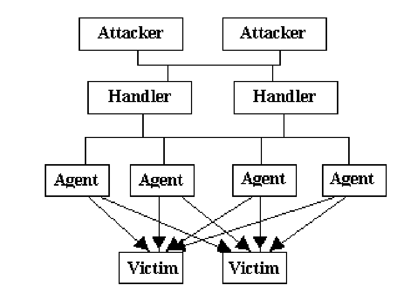 A Distributed Denial of Service Network follows a hierarchical model, with one or more attackers controlling a so-called handler, which in turn controls the hordes of agents that execute the commands relayed to them.