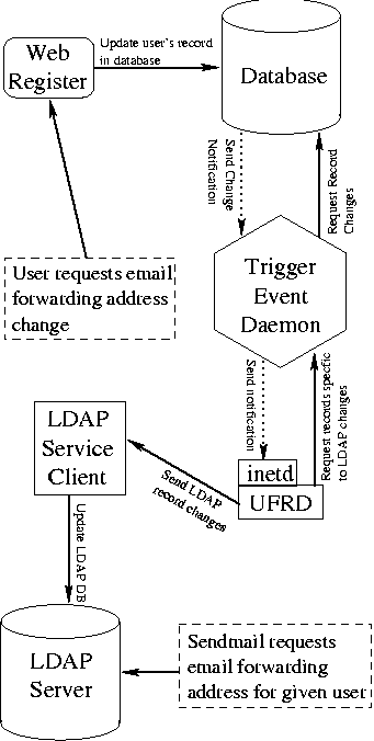 Here is a simplified example to demonstrate ARTIMUS' data flow, which can be seen in Figure 1. Suppose Amy wants mail that is sent to the institutional address help@lanl.gov to be delivered to her departmental server account amy@cic-mail.lanl.gov. Here is how it is done: Amy uses her web browser to go to the Network Registry service and logs in to identify herself. She creates help as a new name which the Network Registry inserts into the database assigning ownership to Amy. Then she sets the forwarding address for help and the web server completes the task by updating the database. The change to the table containing names triggers a database procedure that makes a copy of the updated record and notifies the Trigger Event Daemon (TED) process (see the section ``End Service Propagation''). TED notifies the subscriber services affected by the forwarding address change so those systems can update their local copies of e-mail forwarding information.