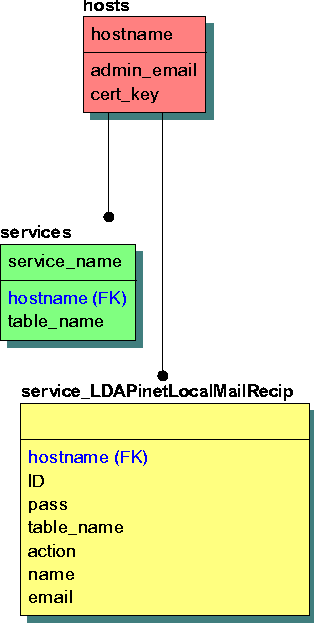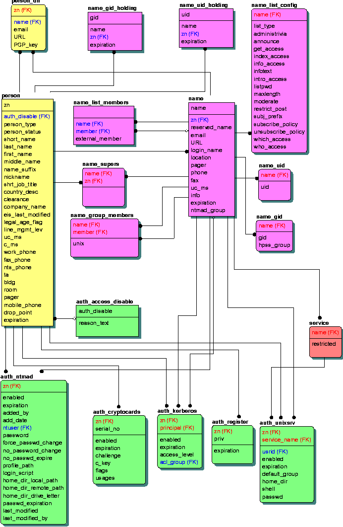 The database tables are divided into three primary categories: one set for person data, one for name data, and one for authentication/authorization data. Person data is needed for ownership; i.e., some person owns each table entry in the database. Person data is also needed for white-pages publishing. A name has an owner and may have attributes such as as a forwarding address, a URL, a UNIX UID, sharing group members, and mail list members. Authentication and authorization data include a person's passwords, authentication tokens, accounts, and permissions or authorizations.