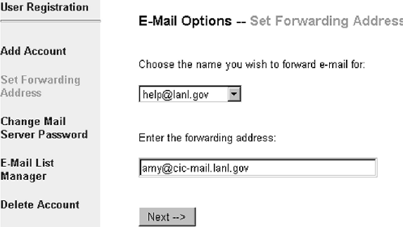 In the previous example of Amy changing the forwarding address of help@lanl.gov, Amy goes to the URL for the Network Registry and authenticates with her employee identifier and password. Selecting the name help she then enters the forwarding address as seen in Figure 2. The Network Registry then does a SMTP VRFY on the given forwarding address and submits an update to the database name table if the address is valid.