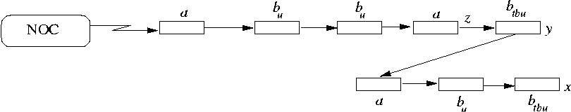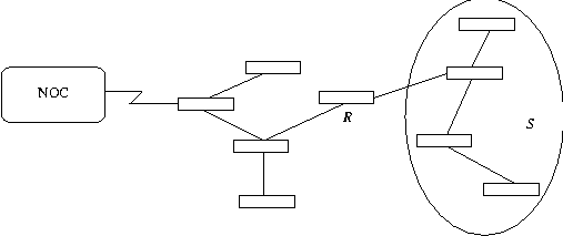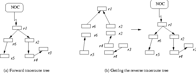 If we have access to the routers (i.e., the router passwords, which are needed for configuration), we can perform a traceroute from the routers to the management station rather than to the routers from the management station. These traceroutes can be put together to deduce the tree from the NOC to the routers. If the routing is symmetric, such a method that does traceroutes from the router would give the same tree as the generic traceroute method. In this case, however, we have the advantage that we can do a restricted traceroute, possibly looking only at the next hop on the routing path from the router to the management station. These {router, next hop} pairs can be put together to get the full tree. For the example in 3a, the method to obtain the reverse traceroute tree by conducting one-hop traceroutes from each of the routers is depicted in Figure3b.